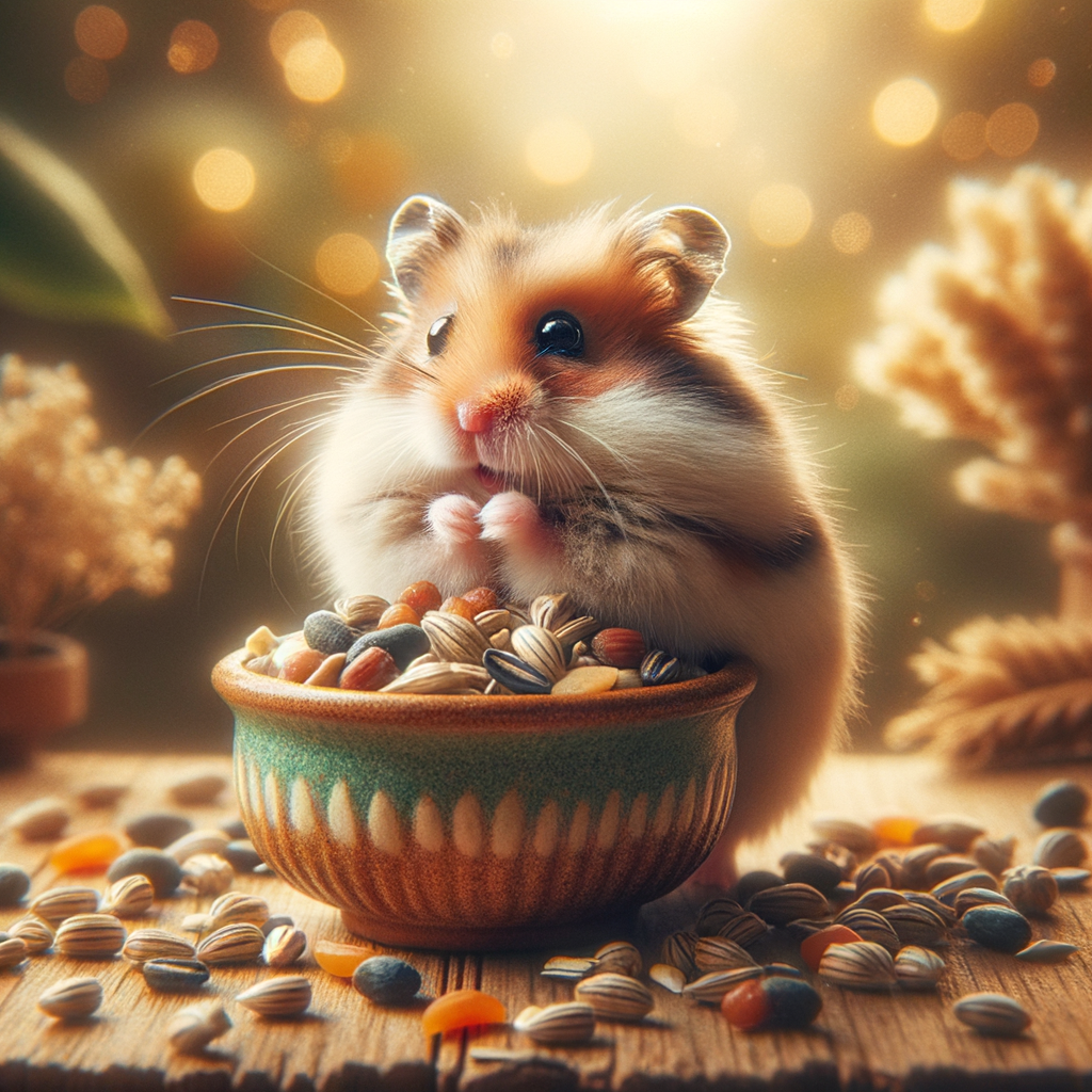 "Create a high-resolution, professional-quality image of a Campbell dwarf hamster eating different types of brown seed mix from a small, colorful ceramic bowl. The scene should be well-lit with soft, natural lighting to create a warm and inviting atmosphere. The background should be softly blurred (bokeh effect) to emphasize the hamster and the bowl. For the photographic detail: Camera: Canon EOS 5D Mark IV Lens: Canon EF 100mm f/2.8L Macro IS USM Aperture: f/2.8 for shallow depth of field ISO: 200 for clean, sharp images Shutter Speed: 1/200 sec to capture the hamster's movements without blur Ensure the focus is sharp on the hamster, highlighting its fur texture and the brown seed mix in the bowl. The overall composition should be suitable for use in marketing brochures and websites, showcasing the cuteness and personality of the hamster."